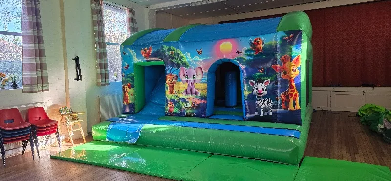 Bring the excitement of the jungle to your next celebration with our Jungle Activity Bouncy Castle, available now for hire in Plymouth and across Devon! Covered in bright, colourful artwork featuring friendly jungle animals like lions, elephants, giraffes, and zebras, this inflatable is perfect for creating a fun and adventurous atmosphere at any event. Whether it's a children's birthday party, school fair, family fun day, or community event, this bouncy castle guarantees endless laughter and excitement for all young explorers.